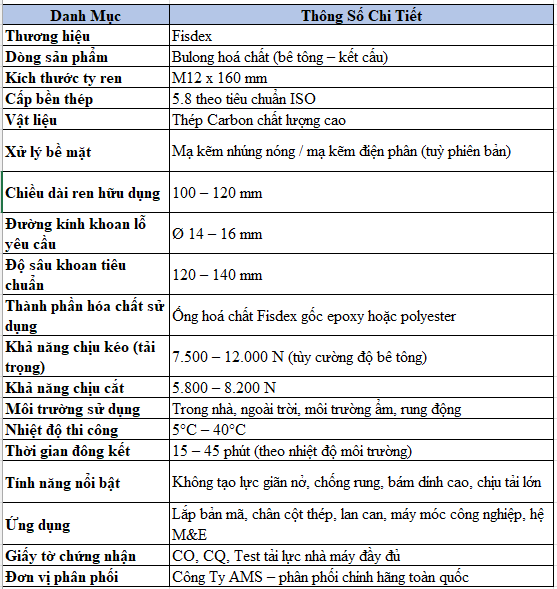 Bulong hoá chất Fisdex M12 x160/5.8 chính hãng AMS – Giải pháp neo cấy bê tông hiệu quả cao