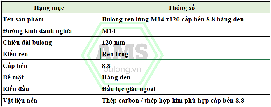 Khi lựa chọn bulong ren lửng M14 x120 cấp bền 8.8 hàng đen, người mua nên nắm rõ các thông số nền sau: