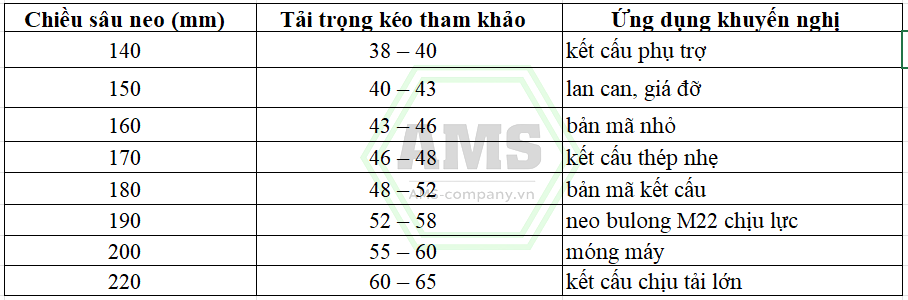 8.1. Bảng tải trọng bulong M22 theo chiều sâu neo